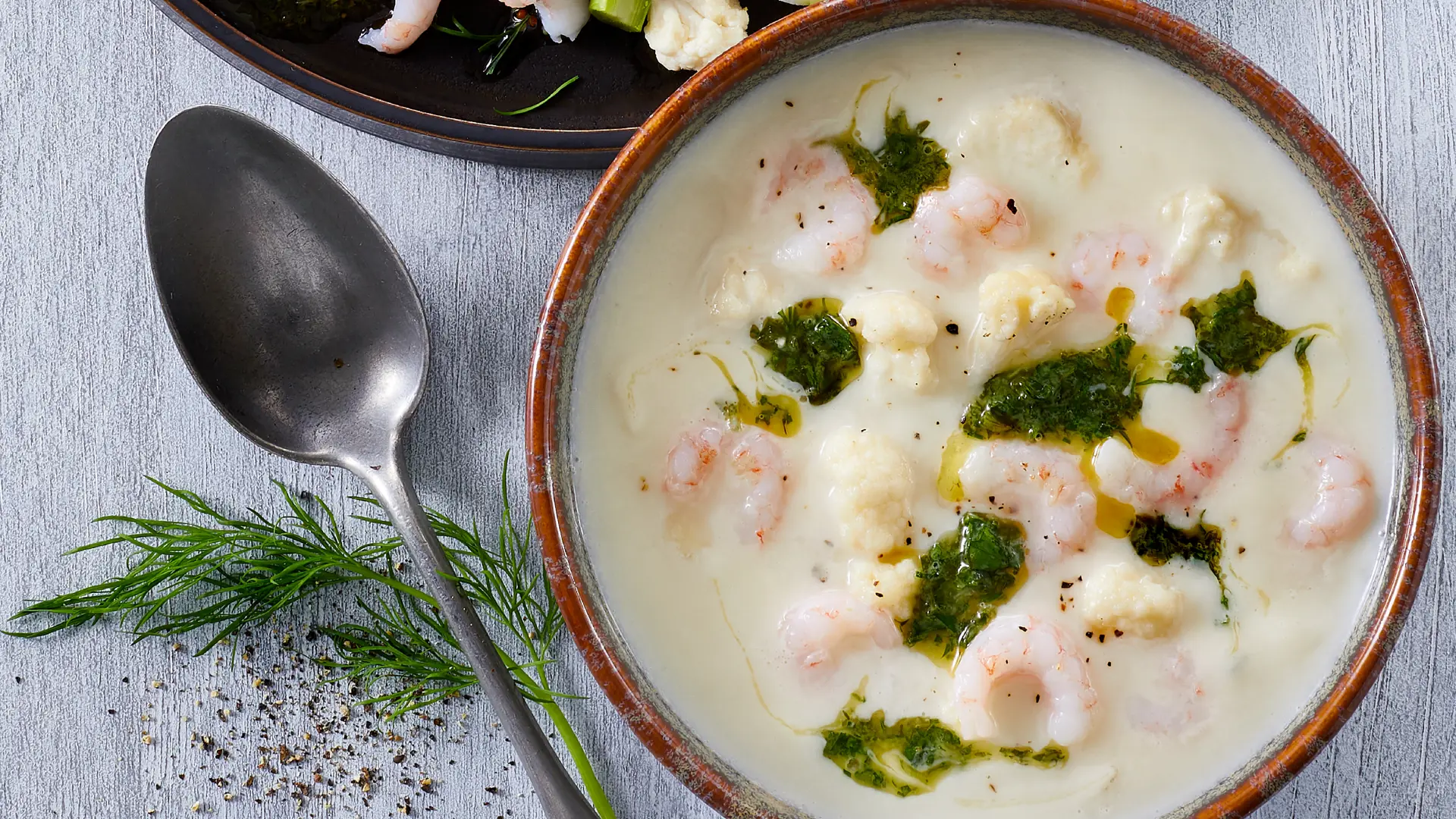 2. Kremet Blomkålssuppe med reker og urtesmør