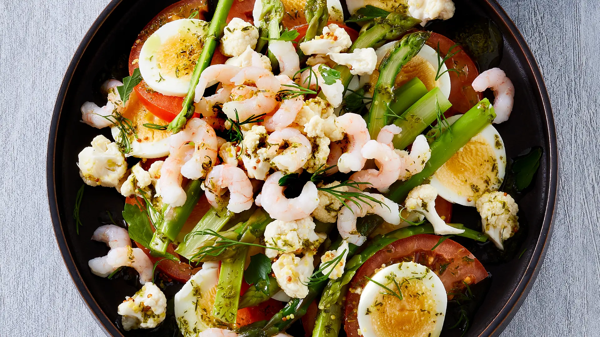 Salat av egg, grønne asparges, tomat, karse og syltede blomkål med limemarinade toppet med grønlandske reker